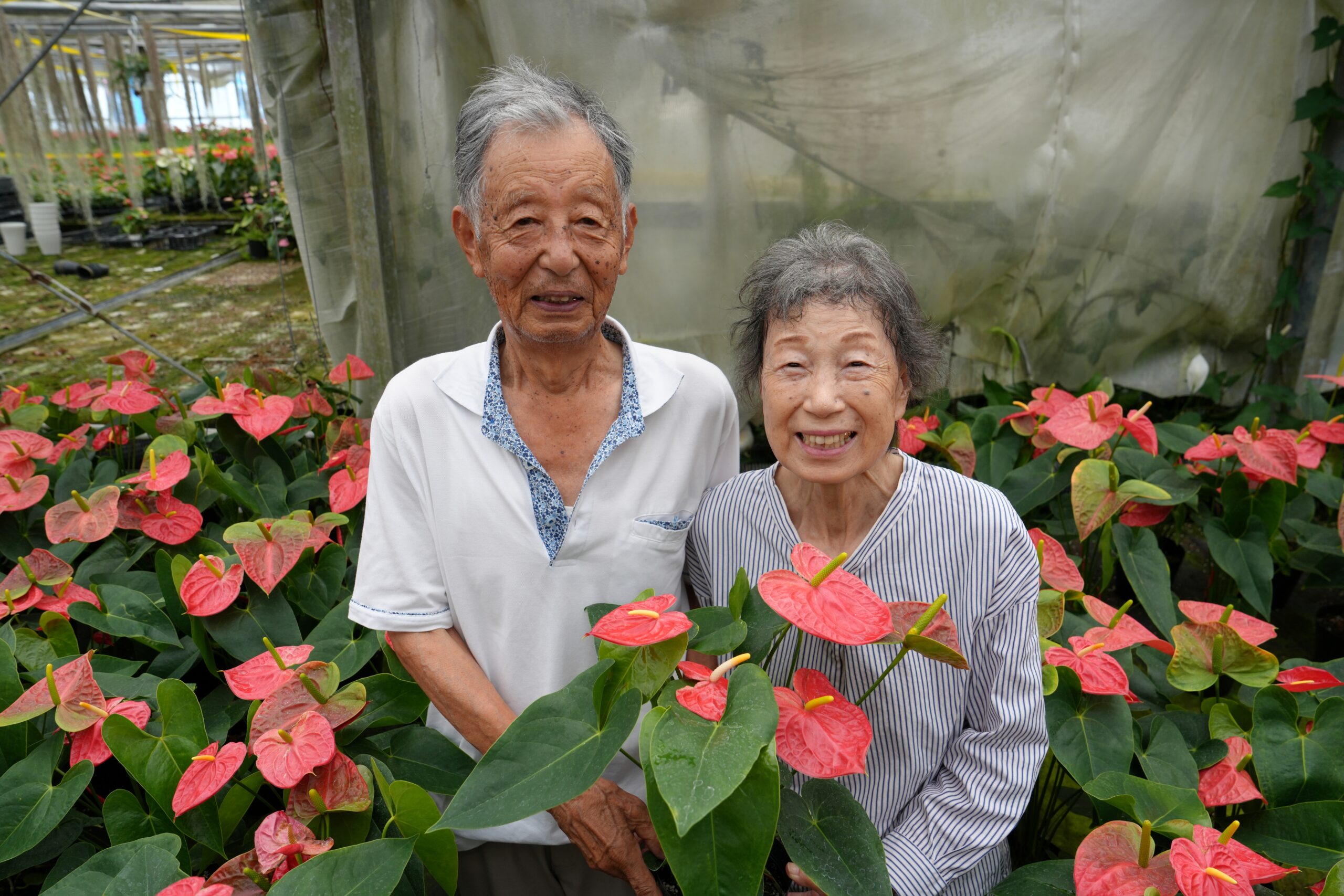 好美さんと二人三脚で営んできた温室では、鮮やかな赤や白、ピンクなど、多彩なアンスリウムが丁寧に育てられている。好美さんも「やると言ったら聞かない人だから。ここまでやったら悔いも全くないわ」と明るく笑う。